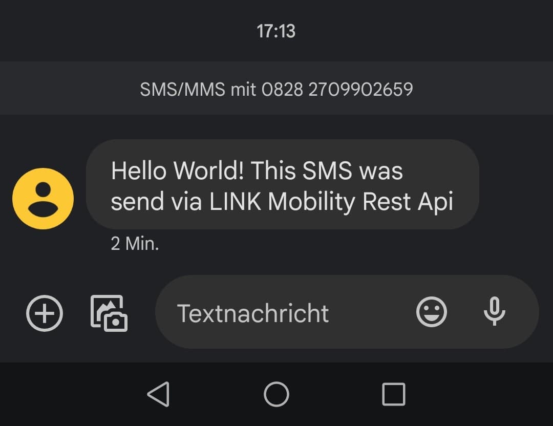 If the status code 2000 is returned, the transmission of the SMS via the LINK | Messaging API was successful.